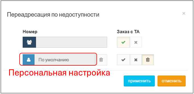• вторая строка со значком "персональные настройки"(приоритетнее групповых) — относится к настройкам, выполненным через АТС (меню "Абоненты", рассмотрено ниже);