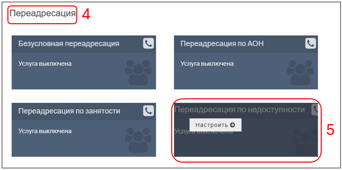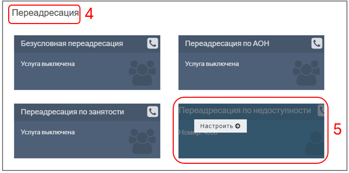 2. При наведении курсора на поле "Переадресация по недоступности" появляется меню "Настроить". После нажатия ― отобразится окно с настройками: