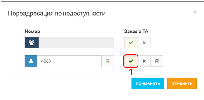 1. Нажмите "V" (галочку) в поле "Заказ ТА", цвет станет зеленым — теперь абонент может управлять услугой с телефона: