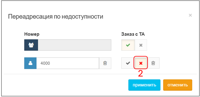 1. Нажмите "X" в поле "Заказ ТА", цвет станет красным, что говорит о запрете самостоятельного управления услугой с телефона: