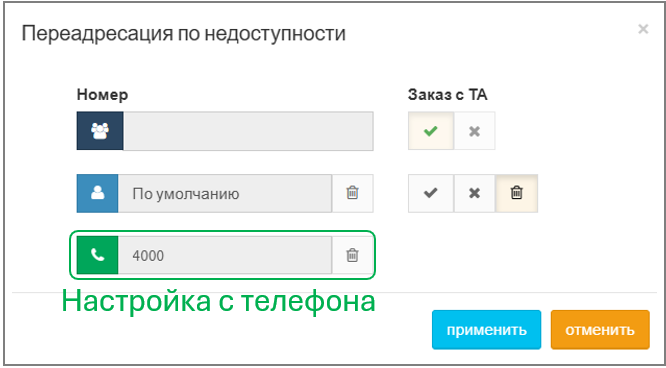Если услуга настроена абонентом со своего телефона, то на АТС отображается цвет поля "Переадресация по недоступности" зелёным.