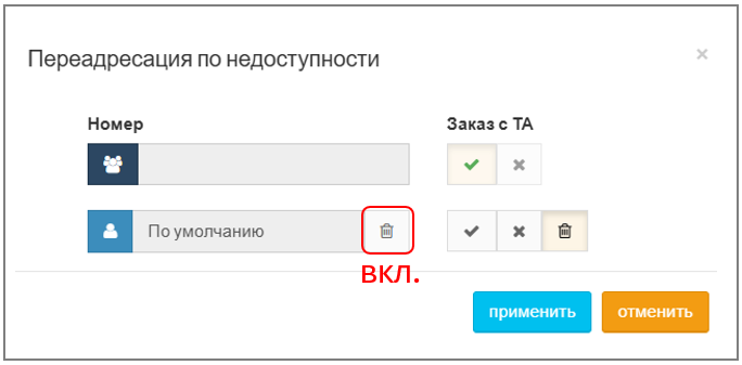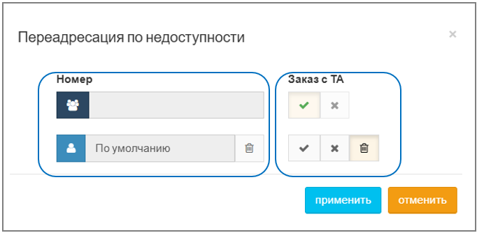 При наведении курсора на поле "Переадресация по недоступности" появляется меню "Настроить". После нажатия ― отобразится окно с настройками, которое состоит из двух полей: