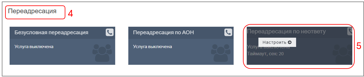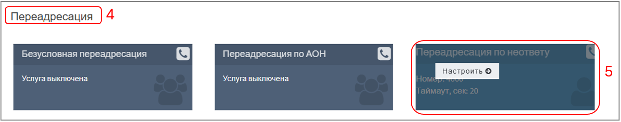 2. При наведении курсора на поле "Переадресация по неответу" появляется меню "Настроить". После нажатия ― отобразится окно с настройками: