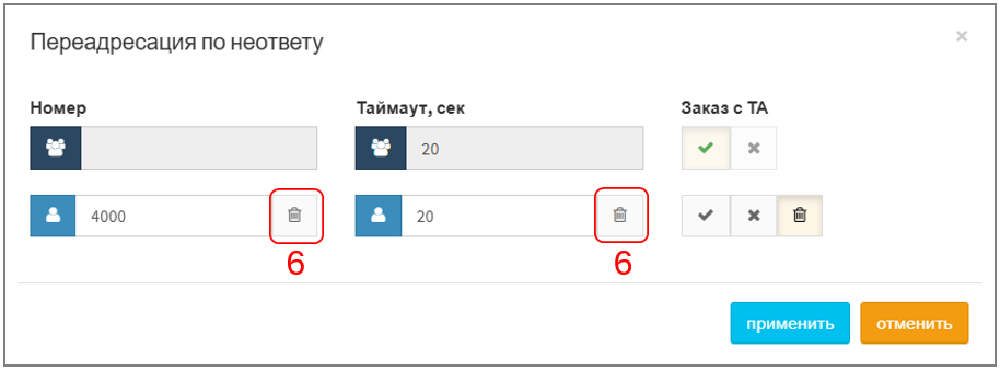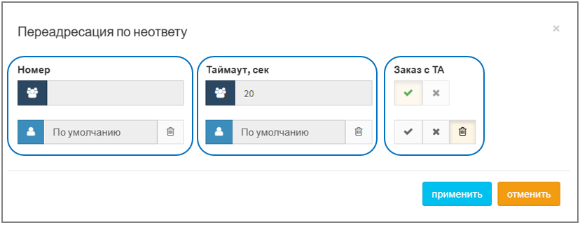 При наведении курсора на поле "Переадресация по неответу" появляется меню "Настроить". После нажатия ― отобразится окно с настройками, которое состоит из трех полей:
