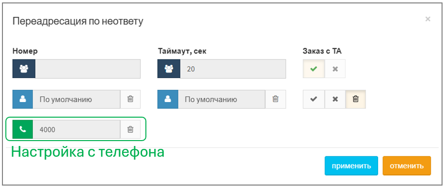 Если услуга настроена абонентом со своего телефона, то на АТС отображается цвет поля "Переадресация по неответу" зелёным.