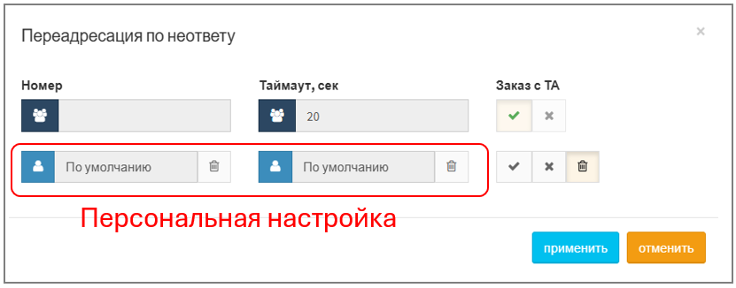 • вторая строка со значком "персональные настройки"(приоритетнее групповых) — относится к настройкам, выполненным через АТС (меню "Абоненты", рассмотрено ниже);
