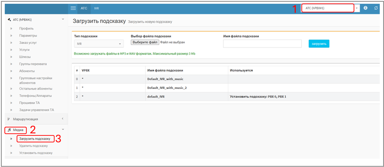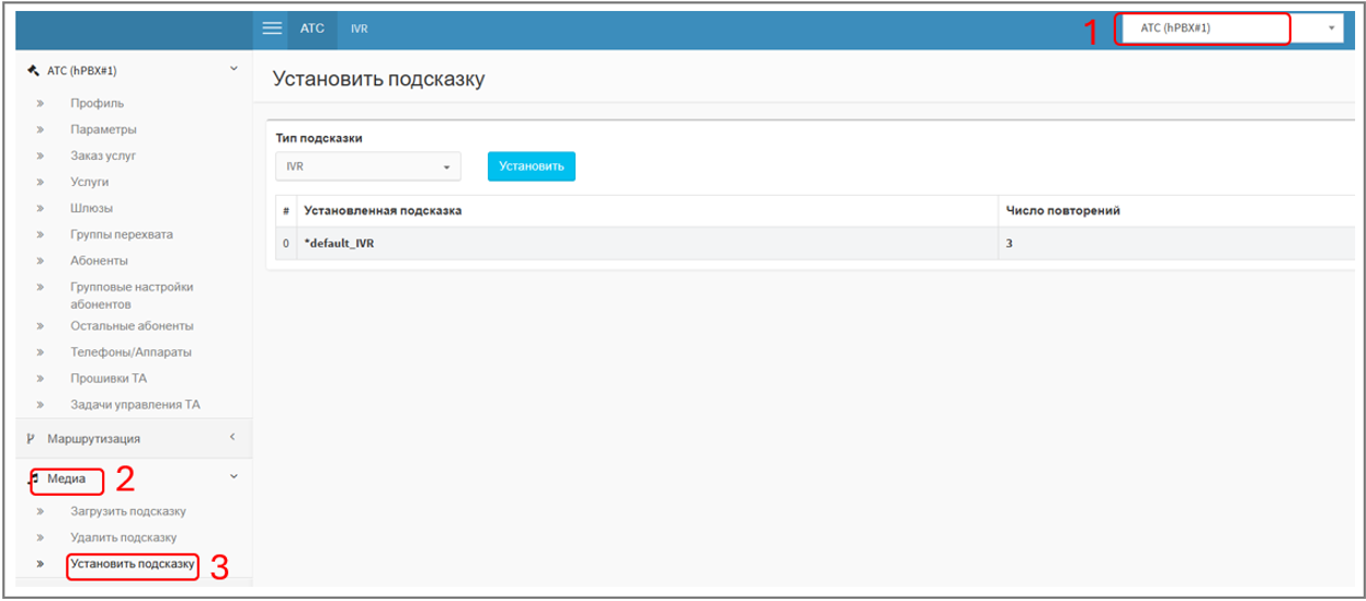 - "Установить подсказку: PBX 1" — подсказка применена как групповая, действует для всех номеров в составе указанной vPBX;